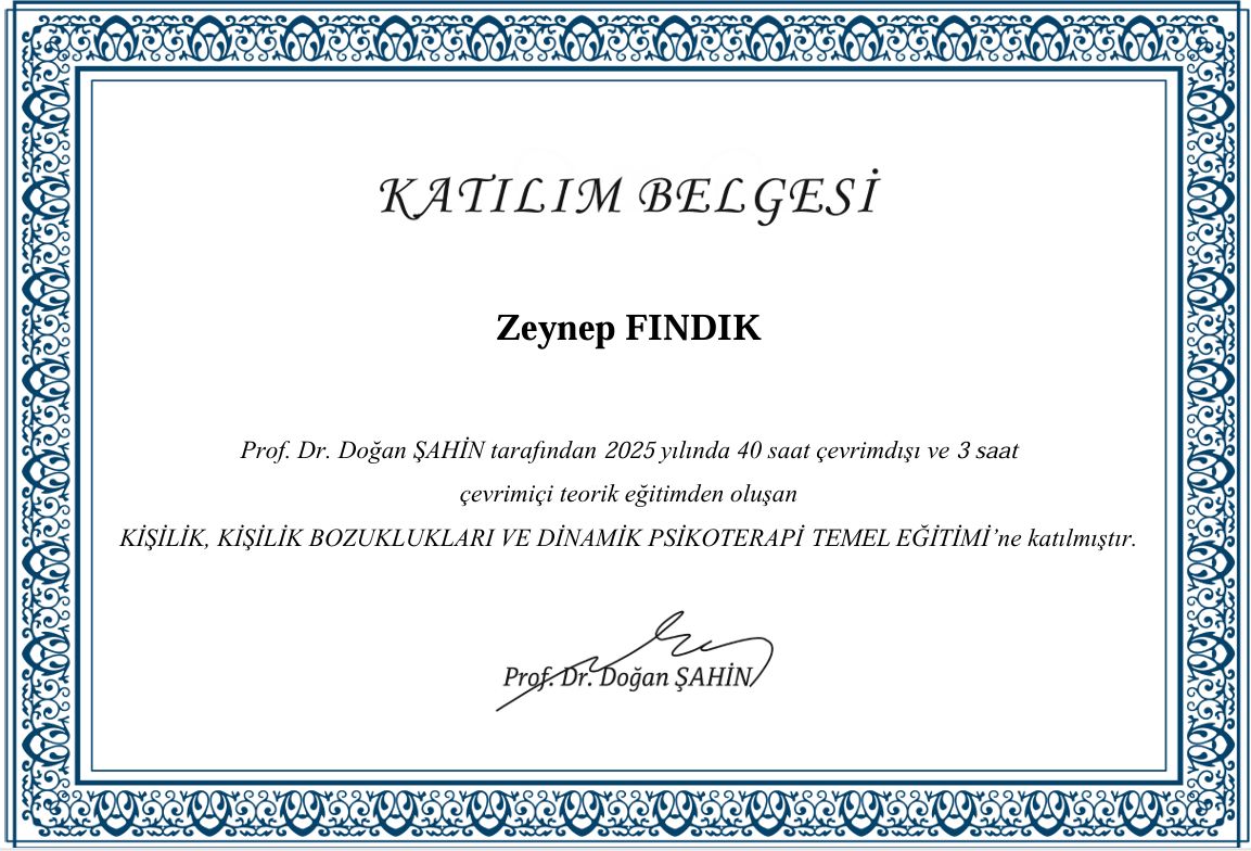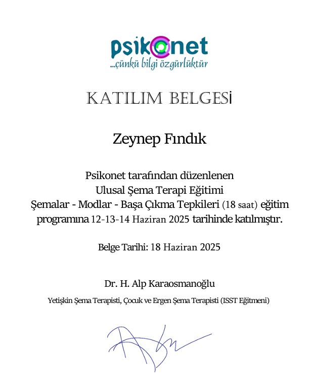 Merhaba, ben Uzman Psikolog Zeynep Fındık. Lisans eğitimimi Ege Üniversitesi Psikoloji bölümünde, yüksek lisansımı ise Aile Danışmanlığı alanında tamamladım.